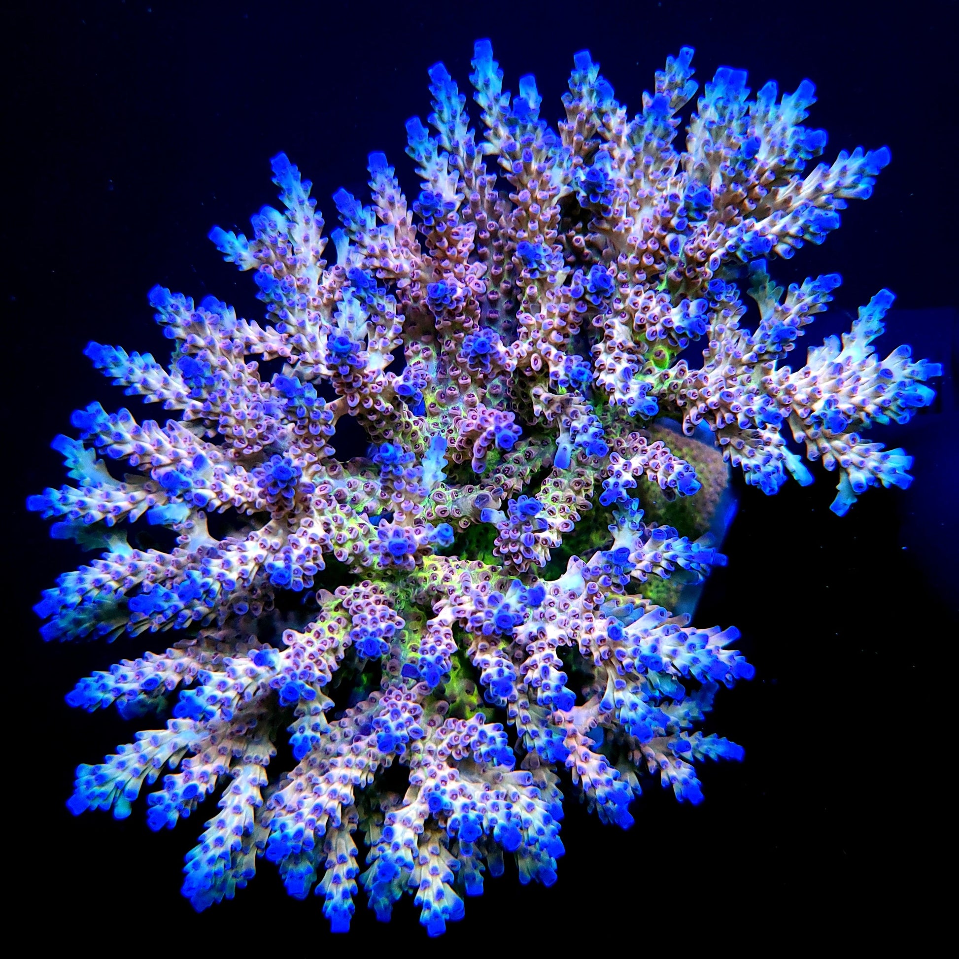 Background: We’ve been growing this acro from BSA for over a decade now. It really shines as it reaches the size of a small colony. It develops green in the base that contrasts beautifully against the cream colored branches with bright blue tips. It forms a near perfect growth form as it grows out into a table.