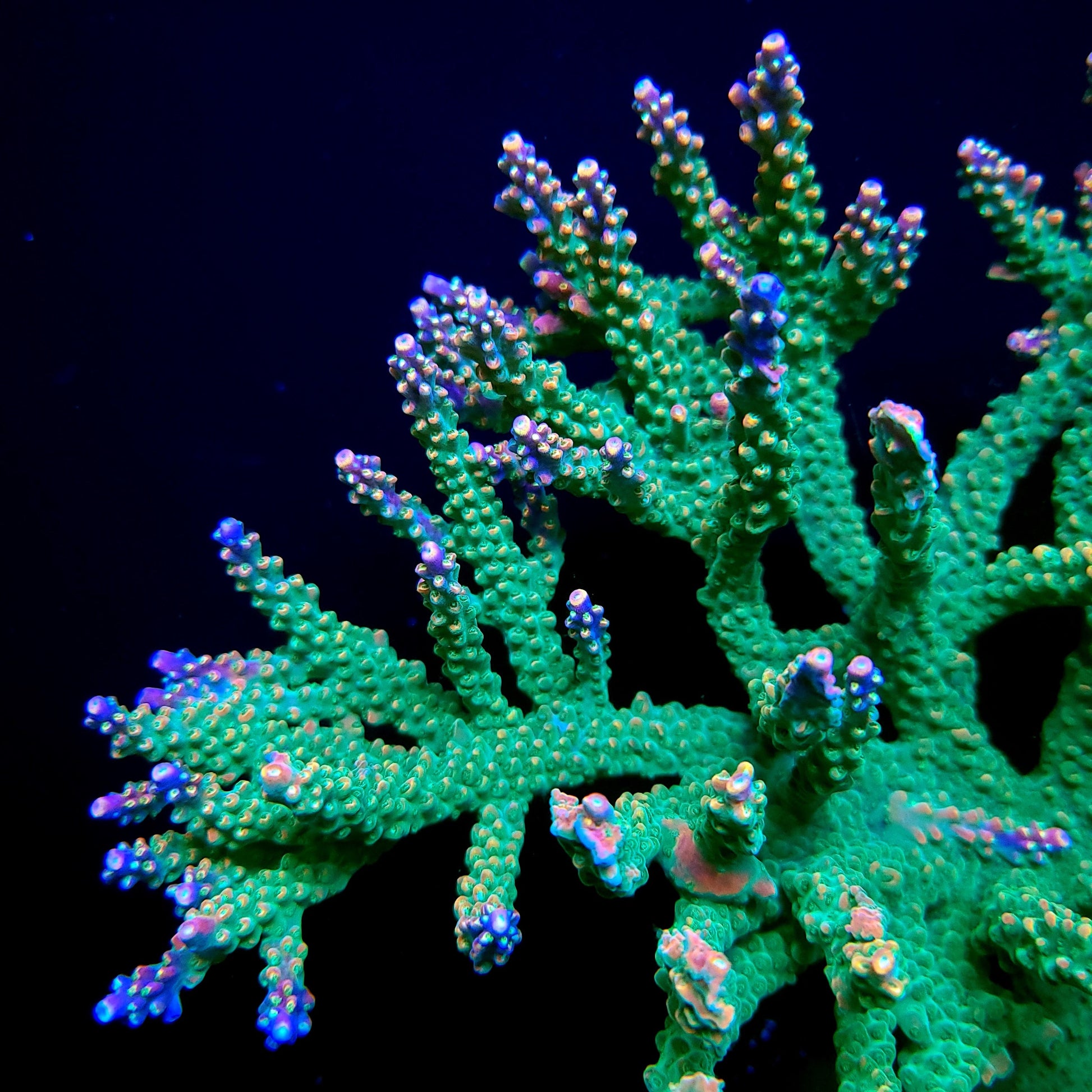 Background: Another acro that rewards those who are patient. The base is a consistently green, but when it throws out new branches, the fun begins. New branches will be purple with orange and blue tones mixed in.