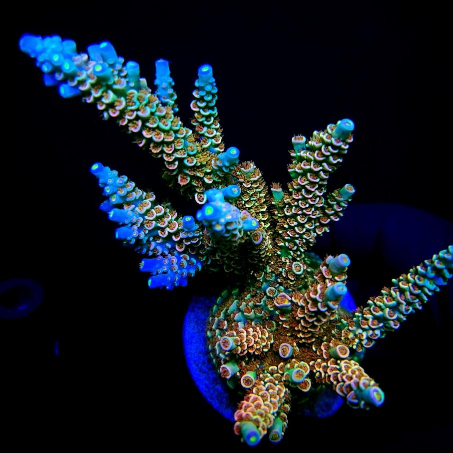 Background: An awesome tenuis from Allan Vo at CRT. It will turn mostly yellow under higher PAR, with green, blue, and orange highlights.