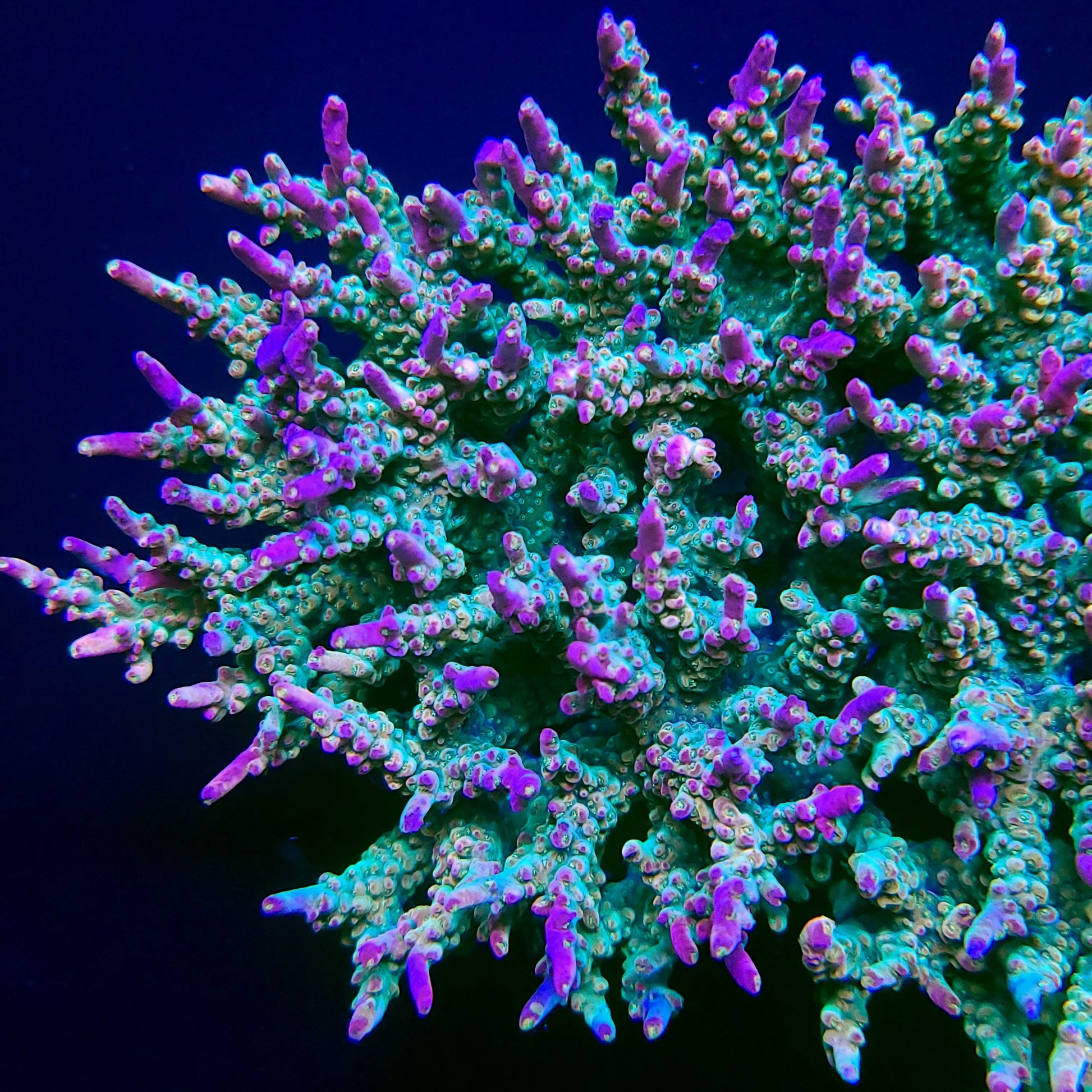 Background: A fast growing coral with high contrast tips. When it's happy it grows impressively fast. A good choice if you have a medium to high PAR spot that needs filled in quickly.