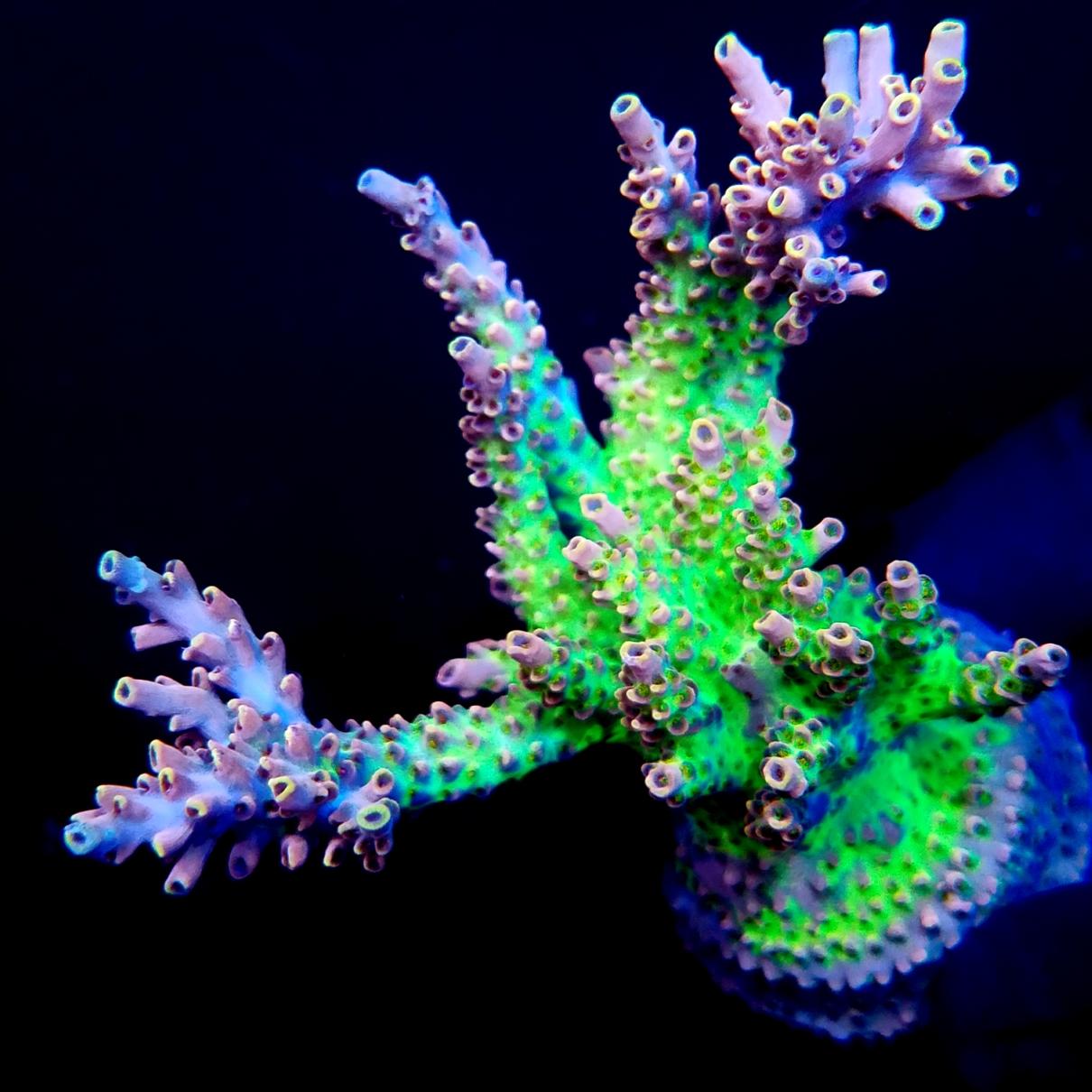Background: A slow growing acro that we rarely frag. The orange and yellow hues glow under actinic lighting. We just wish it was easier to get it to branch out!
