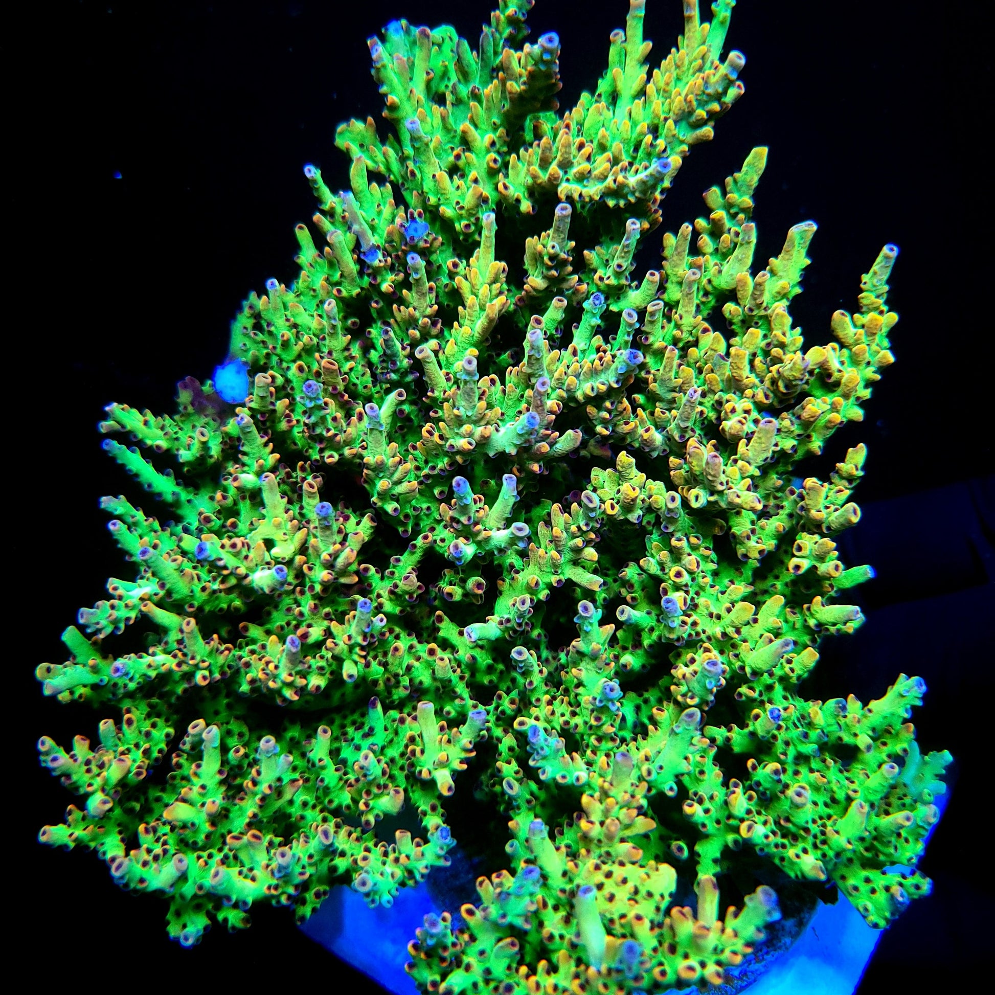 Background: A very unique acro with a green base, orange corallite tips, and red polyps. The leading growth tips also turn blue when it’s at its best. This piece actually colors up better under slightly lower PAR.