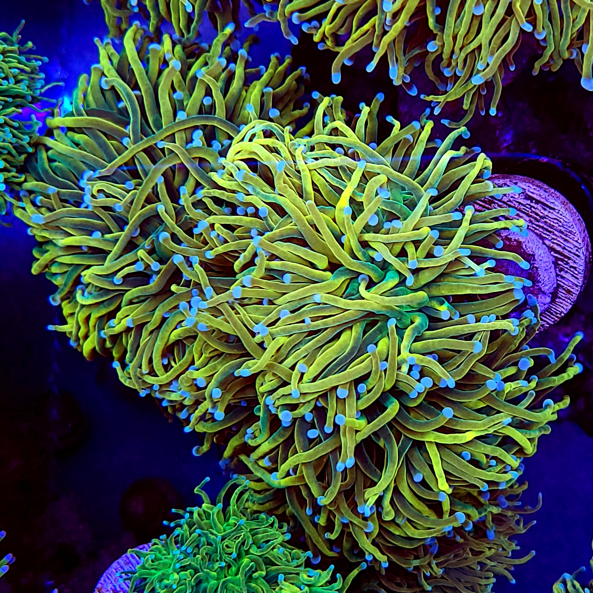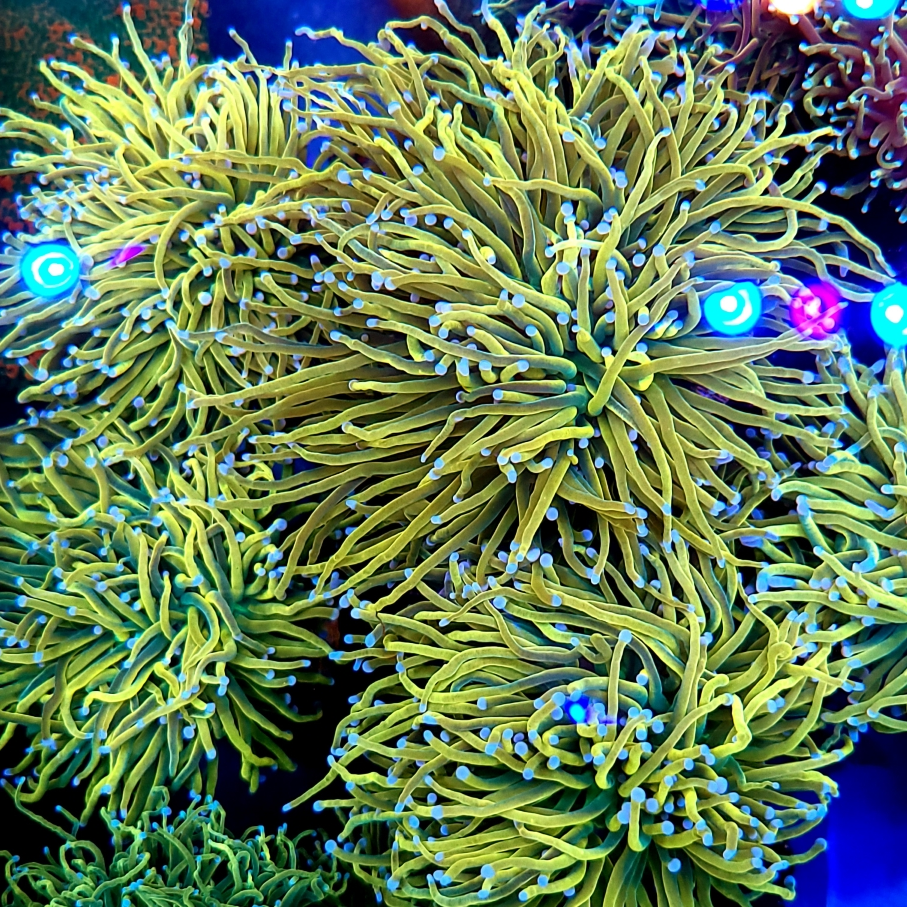 This torch is the closest to a true yellow Euphyllia that we’ve come across. Bright yellow tentacles with green bases, and white tips iconic of blowtorch strains.