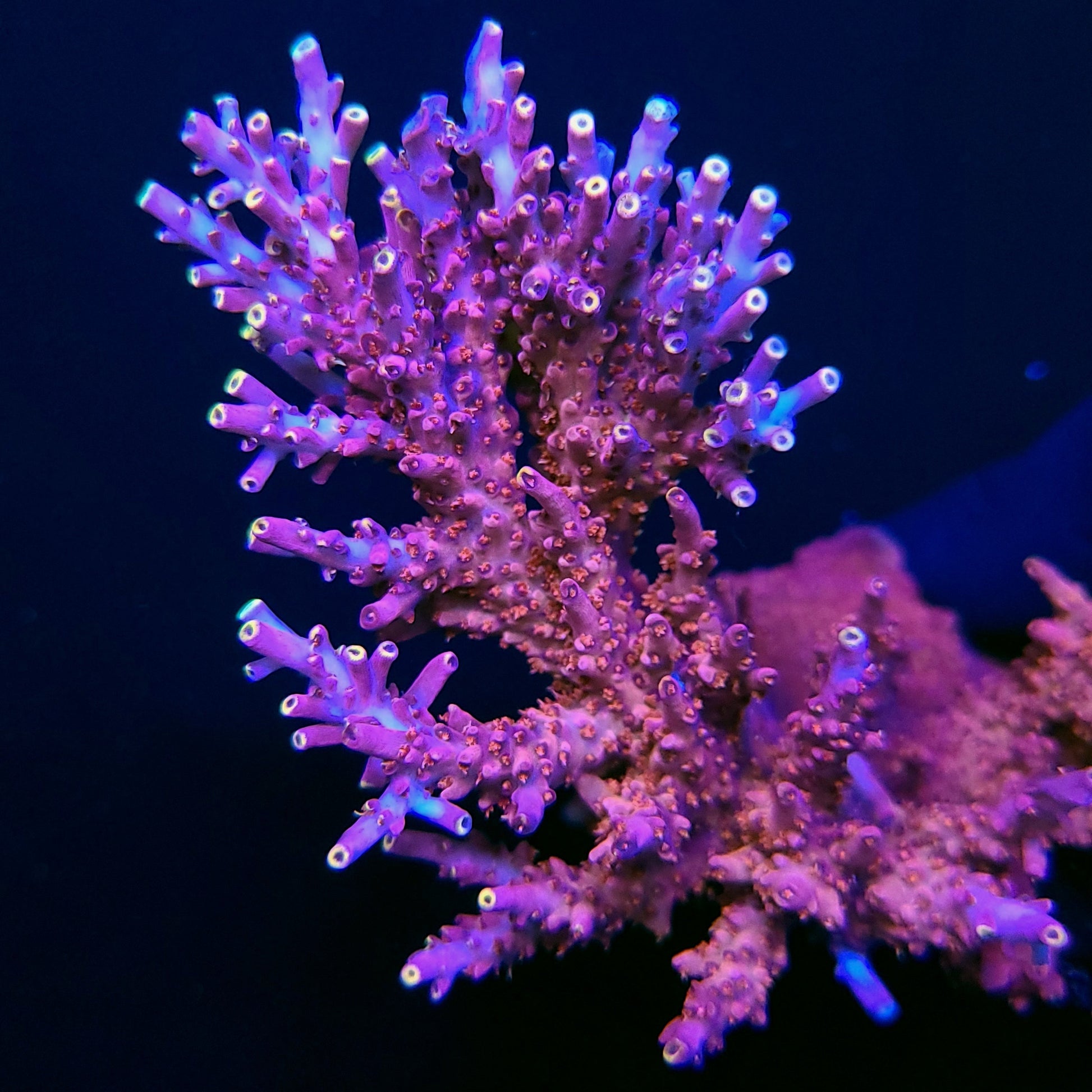 Background: Fast growing red acro with bright yellow tips.