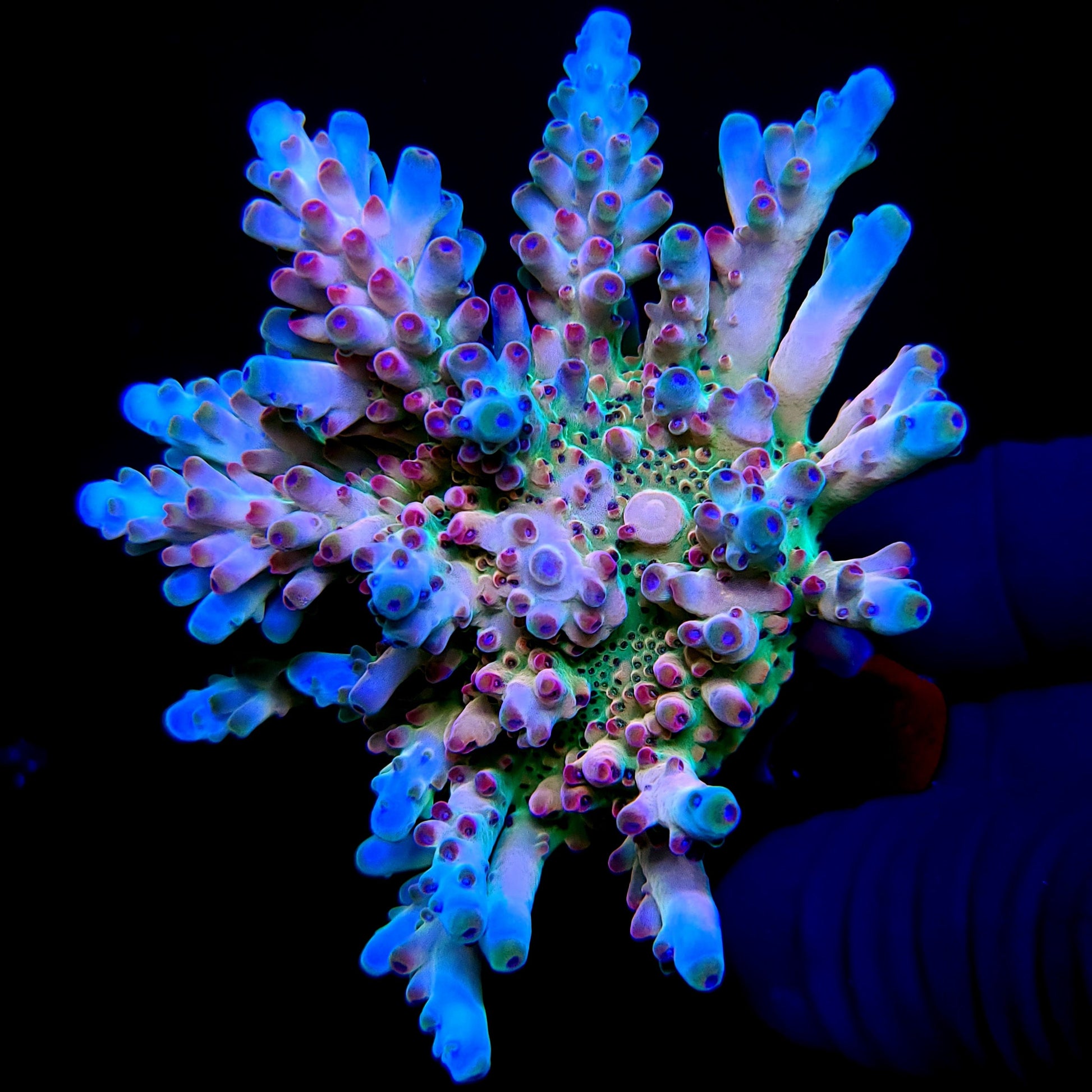 Background: One of the top smoothskins in our collection, and high in demand. We've fragged our small mother colony many times, and she keeps producing. You can't get many more colors on one acro than this!